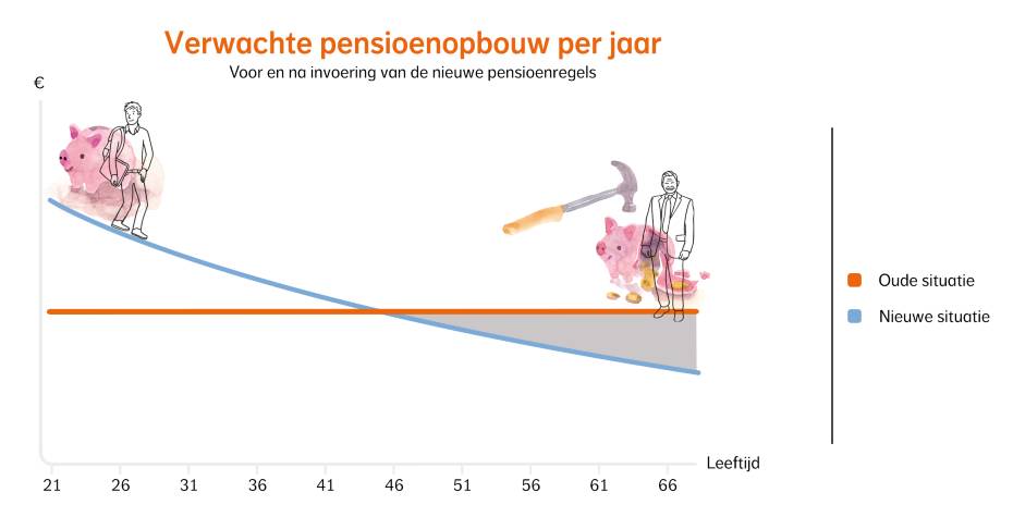 Hoe dat zit? In vergelijking met de oude situatie bouw je voortaan meer pensioen op in het begin van je loopbaan. En minder tegen het einde. Dus ga je halverwege je loopbaan over van de oude naar de nieuwe regels? Dan krijg je niet de hogere opbouw van het begin. Maar wel de lagere opbouw tegen het einde. Je totale (verwachte) pensioen kan daardoor tegenvallen.