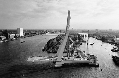 (Foto: Bouw Erasmusbrug, Rotterdam, 1995 © Hajo Piebenga / Nederlands Fotomuseum)