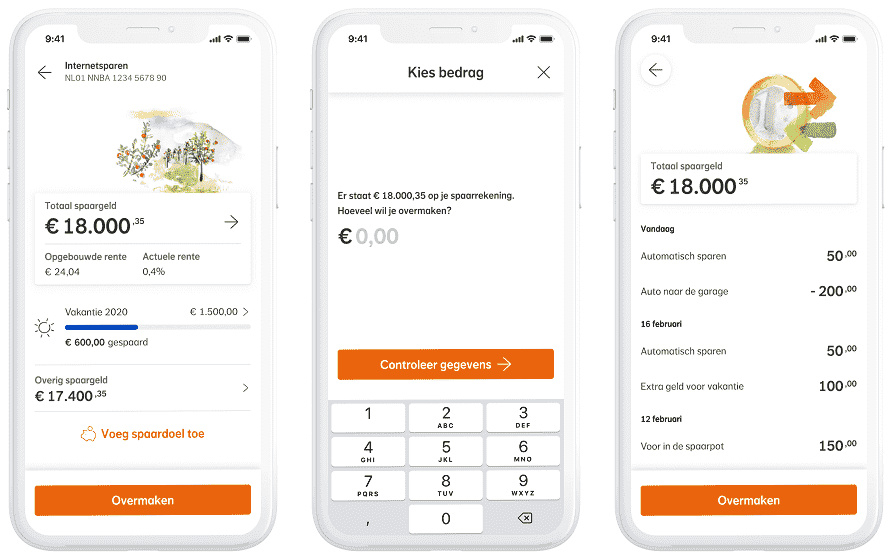 Met de app heb je altijd inzicht in je spaarrekening. Zoals je saldo, spaarpotjes, bij- en afschrijvingen, en rente. Je kunt geld overmaken naar je betaalrekening of naar je Nationale-Nederlanden (Basis) Beheerd Beleggen of Zelf Beleggen rekening, als je die hebt. Binnenkort is dit ook terug te vinden in de productvoorwaarden. Ook kun je in de NN App makkelijk geld storten op je spaarrekening via een iDEAL betaling.
